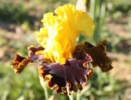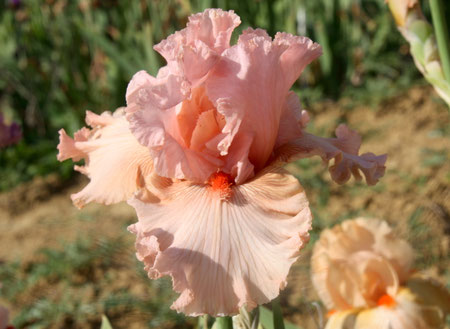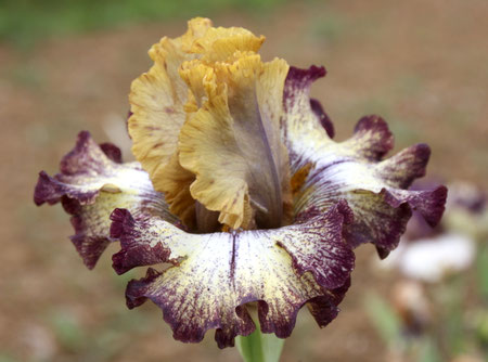 Les pétales sont chamois, les sépales sont pourpre très soutenu. La barbe est couleur pain brulé